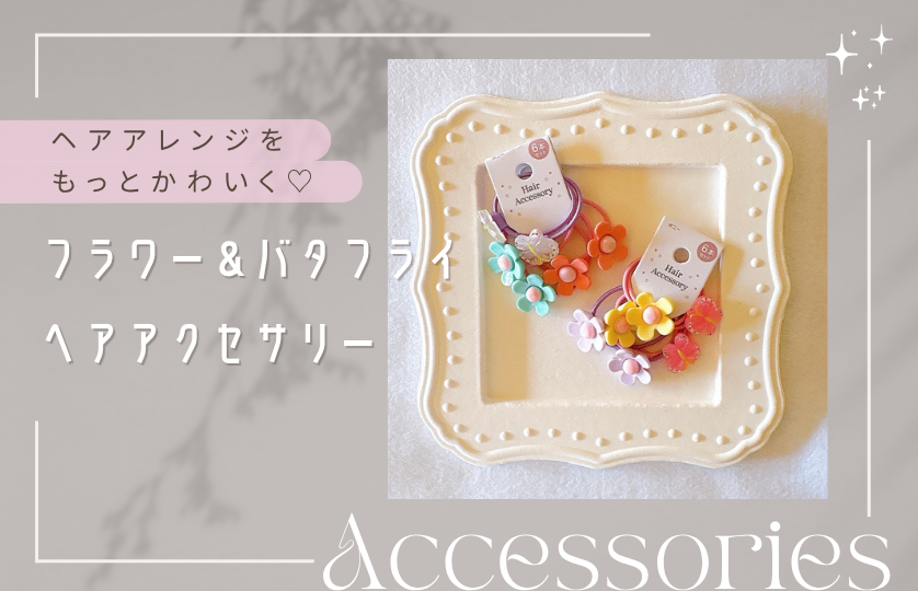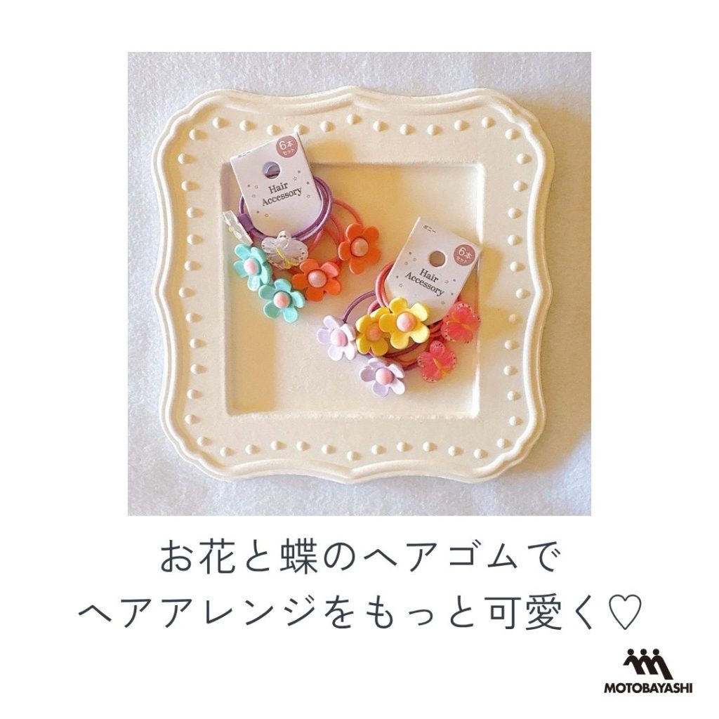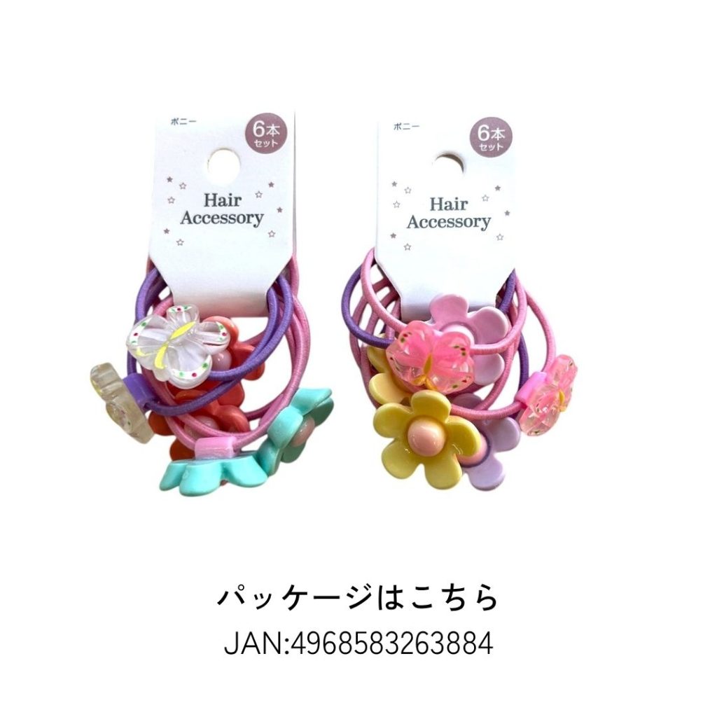小さなお子さまにもぴったりのヘアゴムセット♪お花とバタフライ(蝶)のモチーフがとってもキュートです。6本入りで毎日のコーデに合わせてお楽しみいただけます。Seriaさんで好評発売中です。