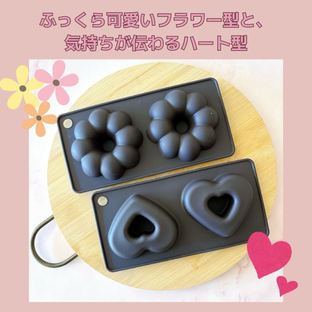 ふっくら可愛いフラワー型と、気持ちが伝わるハート型。オーブン・電子レンジが使えて手軽に焼き菓子づくりを楽しめるのがシリコーンモールドの特徴です。型離れがよく、お菓子がきれいに仕上がるのもポイント☆初めての方でも使いやすく、日常のおやつ作りから季節のイベント、手作りギフトまで幅広く活躍します。家族との楽しい時間づくりにも、ひと手間加えたスイーツづくりにもぴったりのアイテムです。