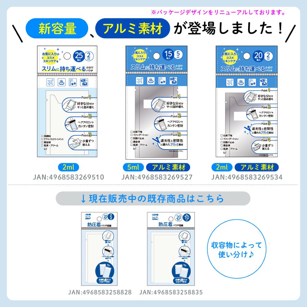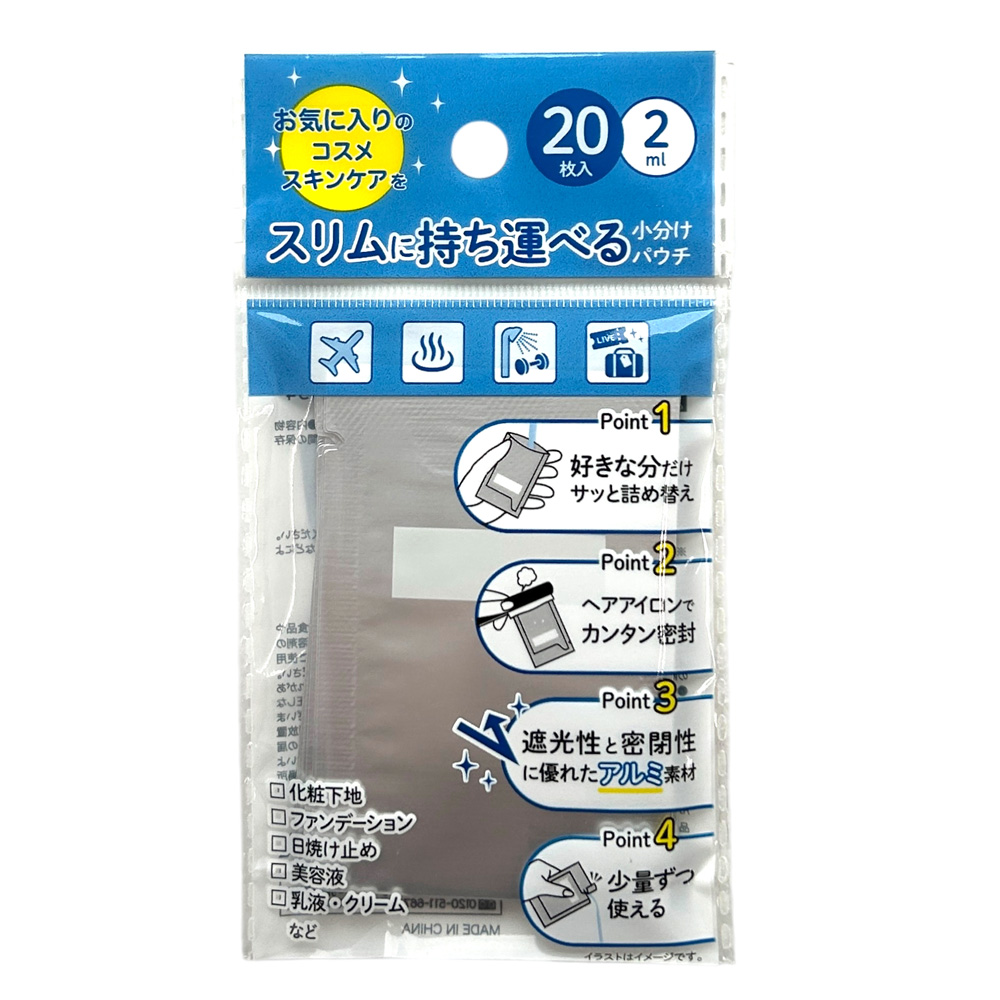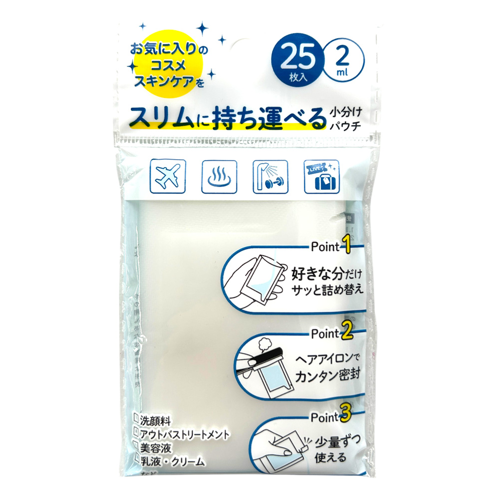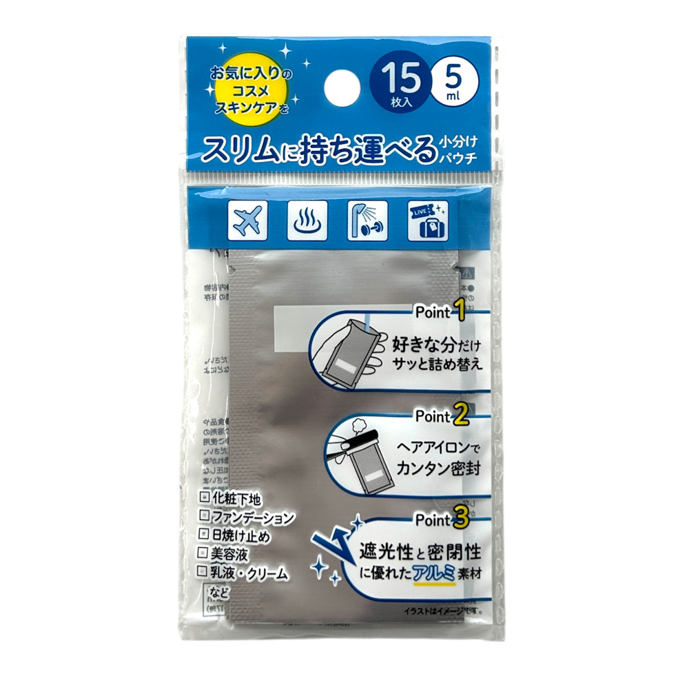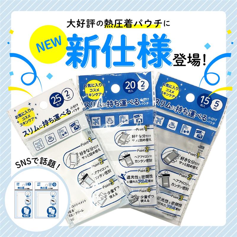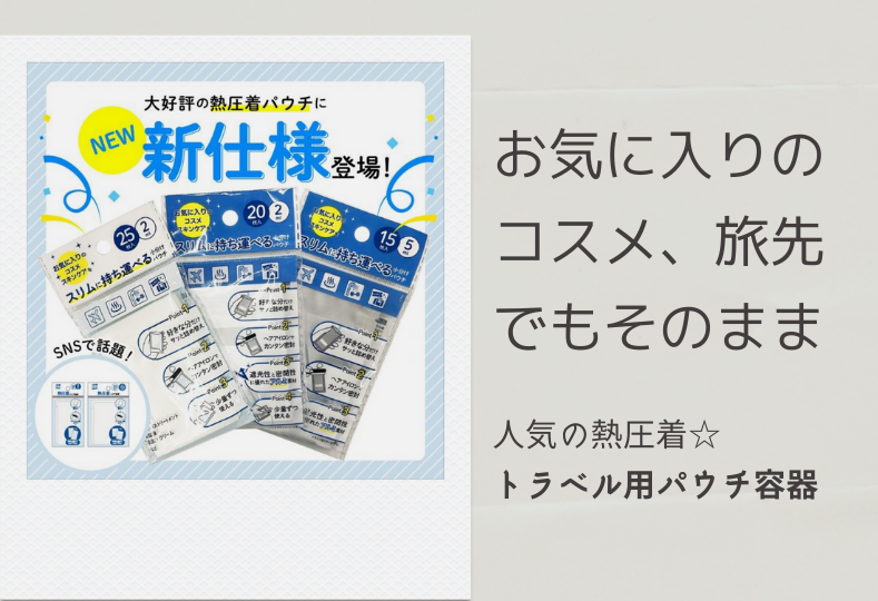 - 普段使いのスキンケア・コスメを、旅先でもそのまま使いたい方へ、大人気の熱圧着パウチに新サイズ・新素材が仲間入りしました!少量ずつ出せる2mlタイプと遮光性・密閉性に優れたアルミ素材。日焼け止めやファンデーションにも最適です◎。100円ショップのSeriaさんにて発売中です。